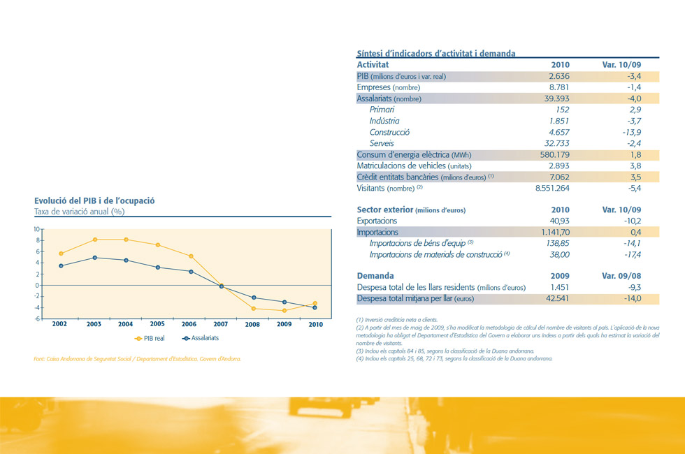 La fuerte crisis económica que sufren las economías desarrolladas, y en mayor mide la europea, desde el año 2008, también ha llegado a Andorra, donde el PIB registró un descenso el 2010, por tercer año consecutivo, del 3,4% real, según apuntan las estimaciones oficiales, publicadas por primera vez el 2011. Este retroceso se enmarca en una tendencia a la pérdida de dinamismo iniciada el 2005, después de haber vivido un largo periodo de expansión económica entre 1997 y 2004, con un crecimiento mediano del PIB superior a las medias española, francesa y europea.